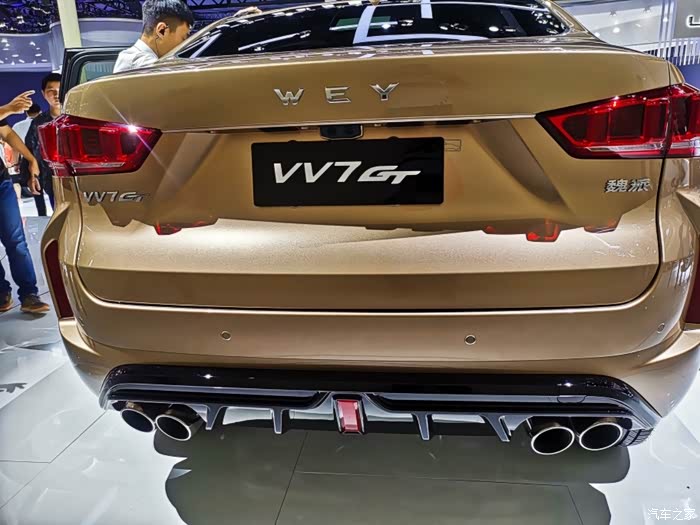 在这两年随着国产汽车的不断进步,很多车企纷纷推出了轿跑式SUV,很早就通过汽车之家了解到这次车展上WEY品牌推出了更加彰显运动感与时尚感的VV7 GT,可惜只是在报导上对它有一些了解,却未近距离地实地观看。VV7 GT的前脸的造型几乎与现款VV7一致,如果说在外观细节上的变化主要来自中网增加了的镀铬装饰,蜂窝状的雾灯处变成了横条型的密封式,而且还加入了黑色的运动裙边,更加突出VV7 GT年轻化的运动感。在外观上变化最大的就是VV7 GT后半车身的造型从C柱开始车身下坠,最后形成一个GT车型常见的溜背设计,与现款VV7有了较大的改变,尾部排气依旧采用的是双排四出的圆形排气布局。