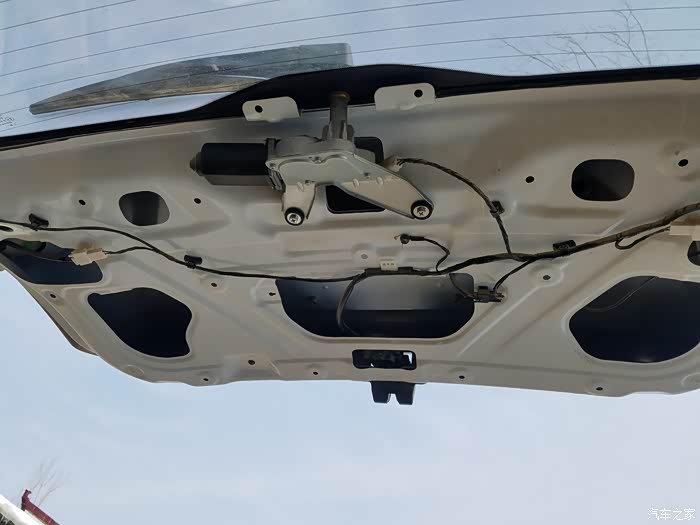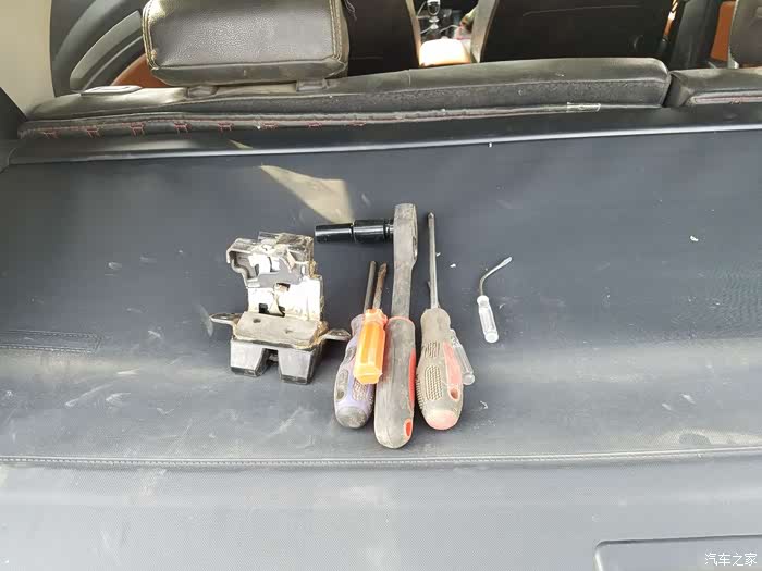 准备取下坏了的锁块。可是楼主走进了一个误区。在这个状态下锁块是不可能拿出来的。于是楼主狠下心来。把后备箱的内饰板拆下来。