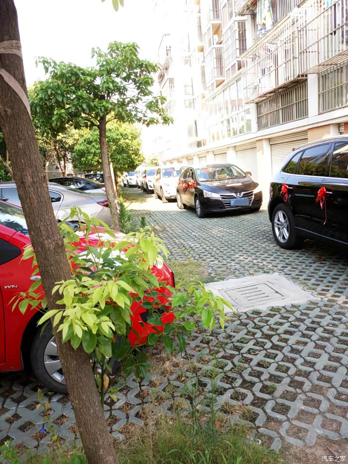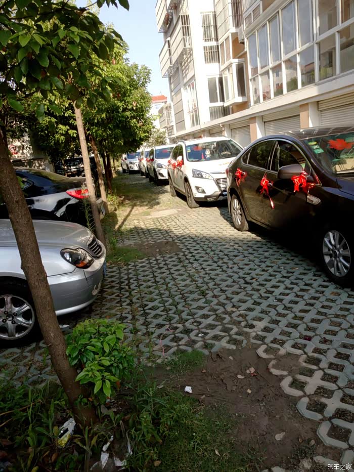 小区里不大的车位被我们婚车队占得满满当当,在居民区里我们可是很守秩序的,不乱按喇叭、不大声喧哗。