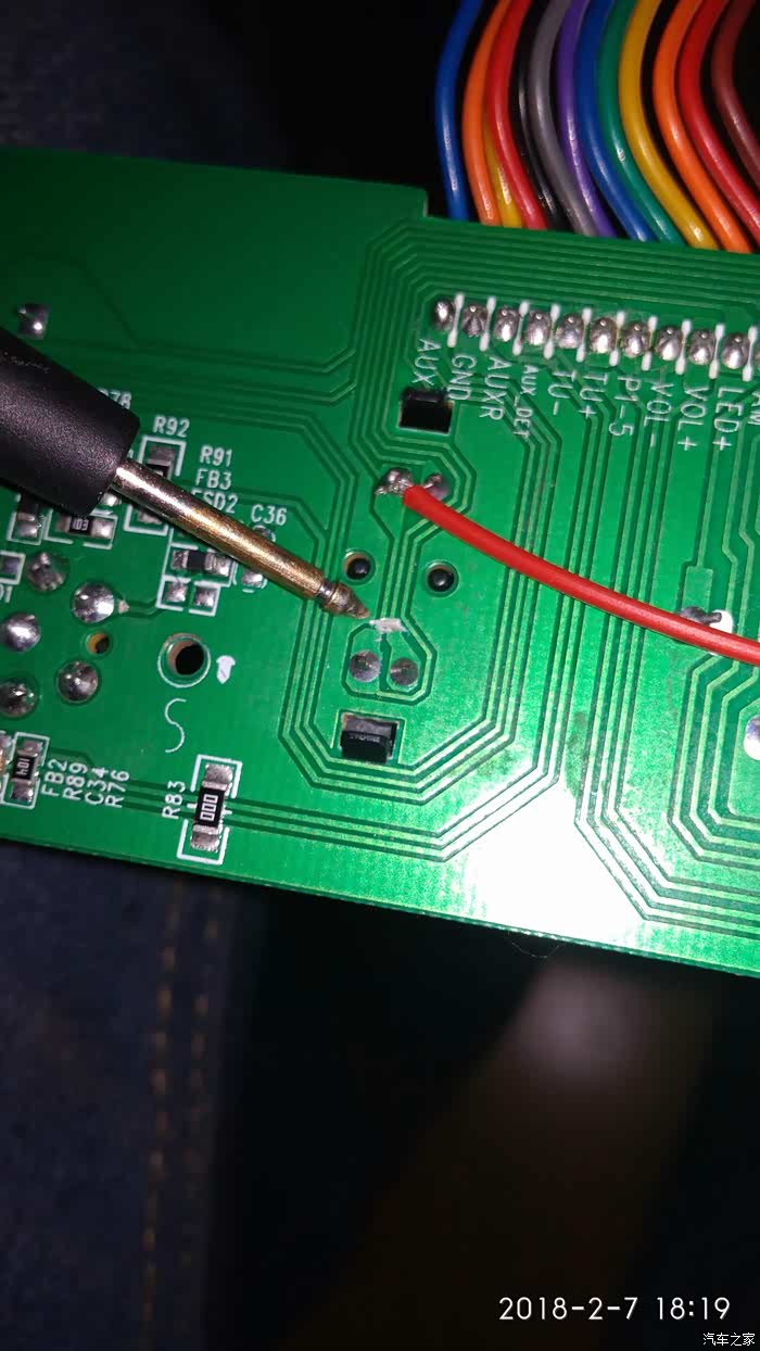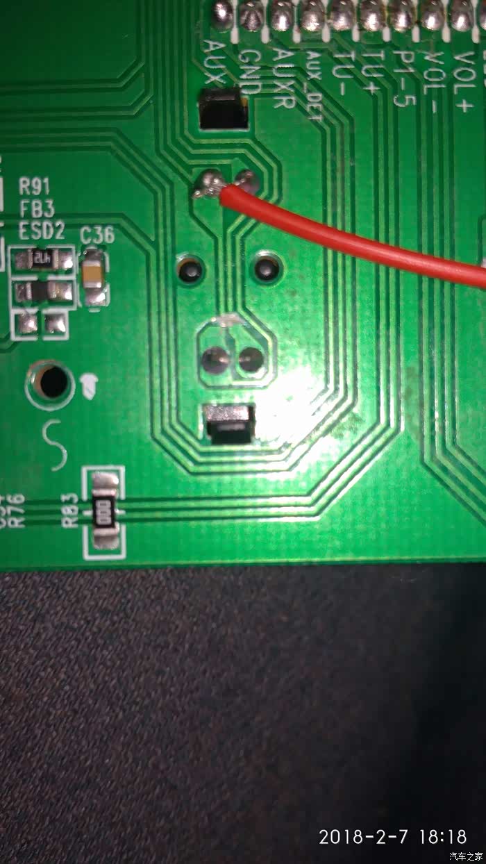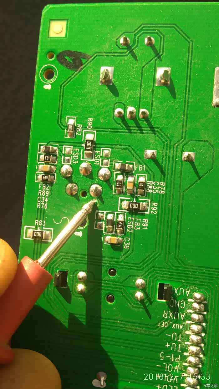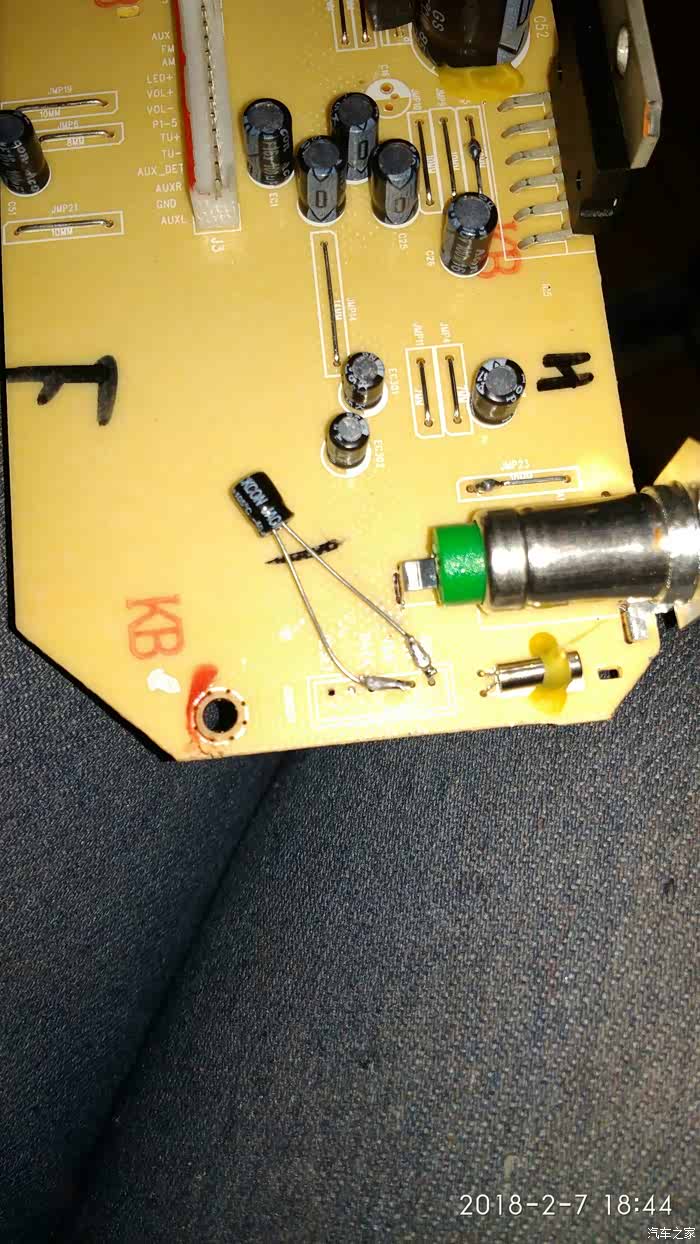 这个地方是插上音频线自动转换的段子,就在音频插口背面,我们把铜箔切断,这样不插音频线时我们通过面板也能转换音频入与收音。我们要用音频输入来改蓝牙的。