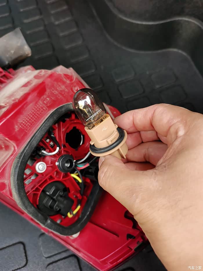 逆时针转动灯泡座,就可以将刹车灯泡取下。