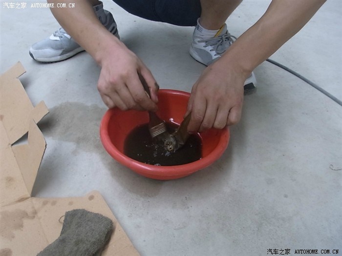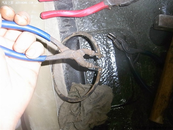 5:在清洗好后,套上新密封圈时,在密封圈上抹点润滑油,最好越滑越好啊,(我抹了机油不行的,很费劲的,最后弄了点比较粘稠的废机油稠点好啊!最好用热水烫一下再抹油安装,安的时候非常费劲,先用手用力按,后来我干脆用脚使劲一压,就OK了!
