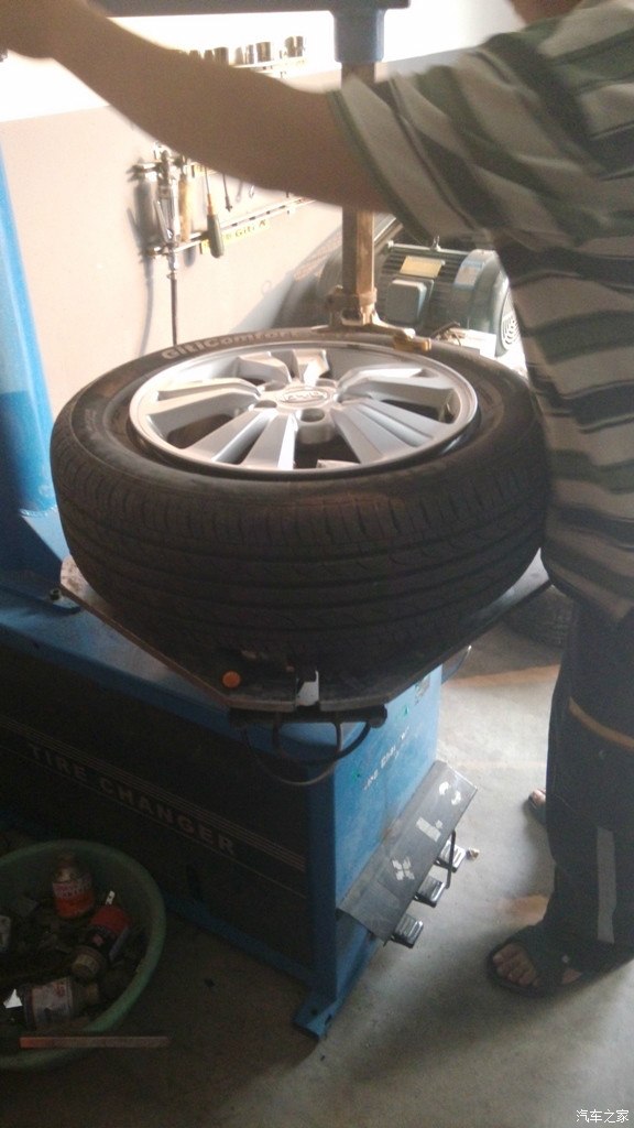 注意:这个轮胎上有一个红点一个黄点,黄点对准气门嘴。给我安胎的家伙什么都不懂,把红点对准了气门嘴,造成初始平衡很差,打了很多平衡块。