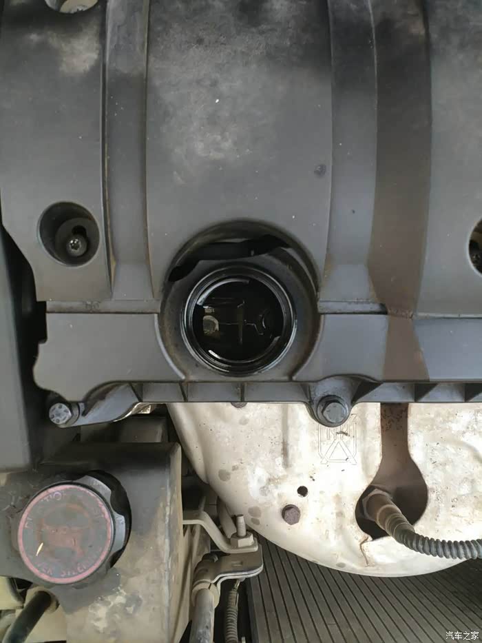 把新机滤装上去后,逆时针拧加油盖90度,到如图中的位置,就可以取下盖子加机油了。