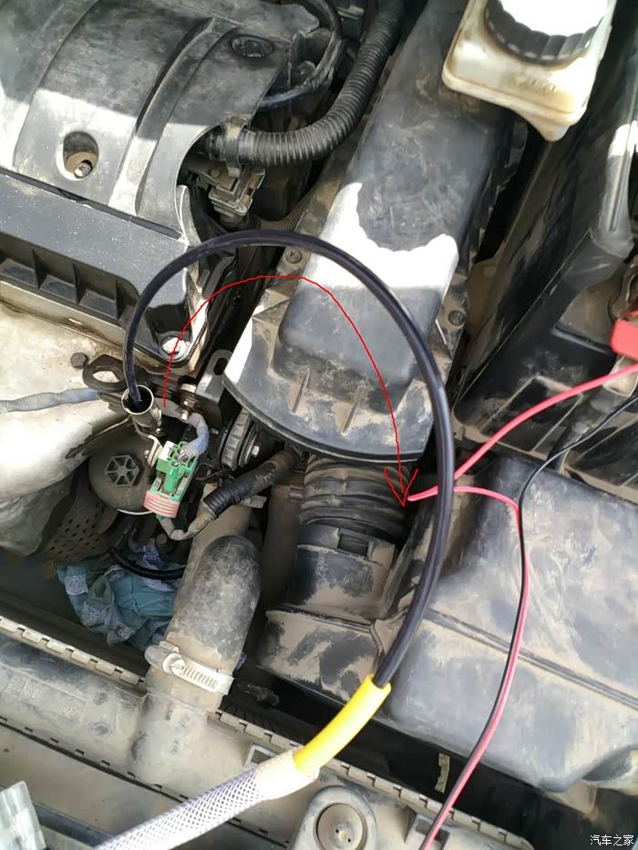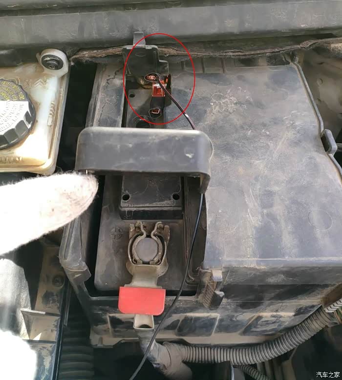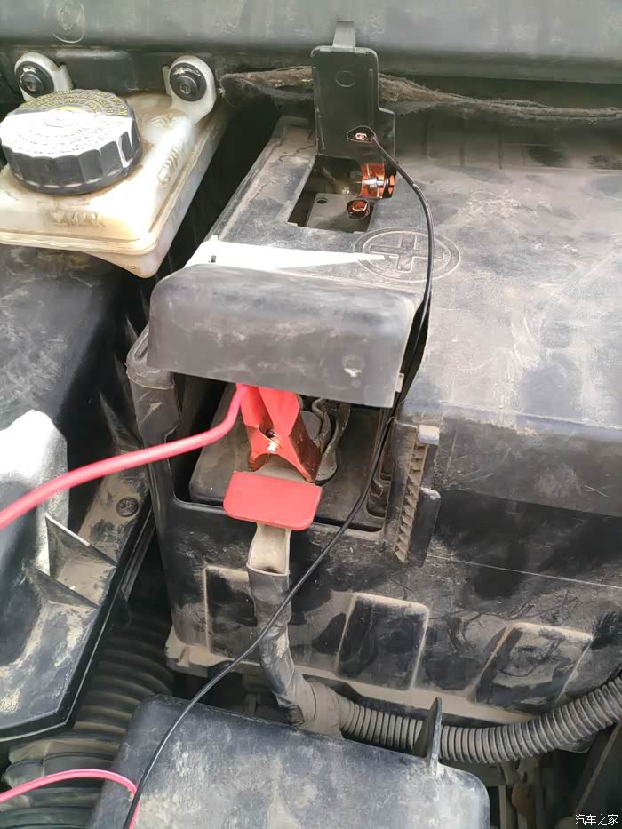 估计是非要将负极直接接到电瓶上,于是把电瓶盒子向上抬一些起来,终于可以勉强把负极的夹子勾上负极。
