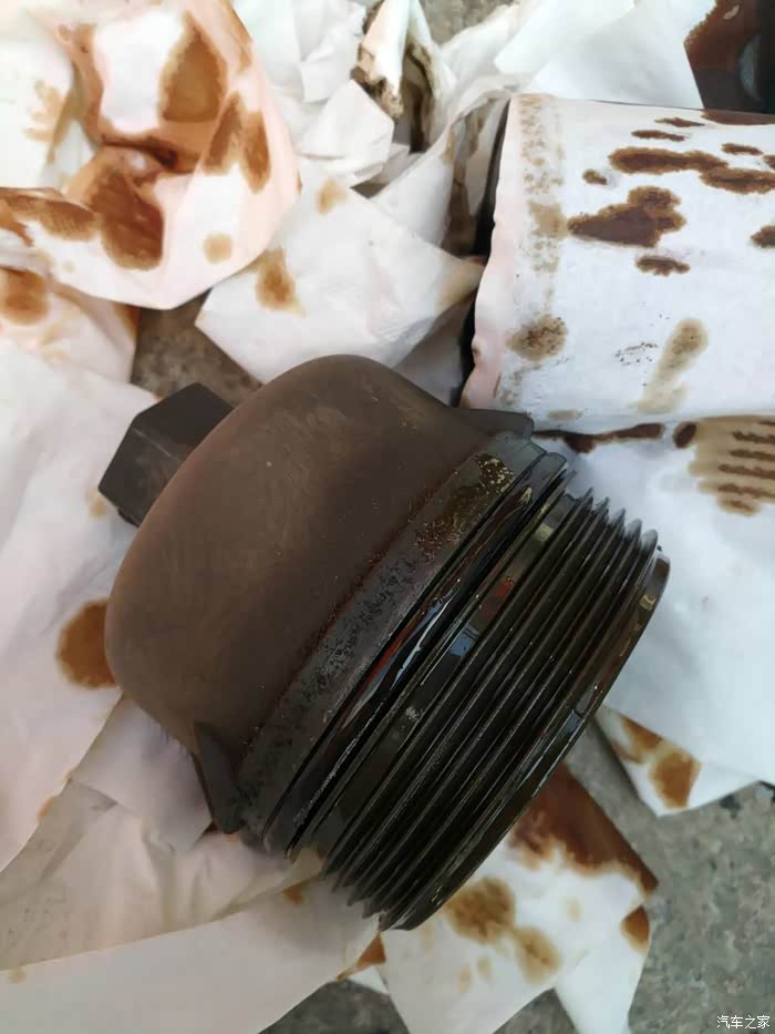 把机滤从盖子里取出,背景上面大坏的油是机滤里的脏油,已经脏成咖啡色了。