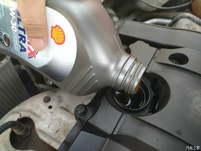 倒入清亮微黄的全合成5W-30超凡喜力。根据抽出的机油量,估计有三升,于是先连倒三瓶,再检查机油尺。
