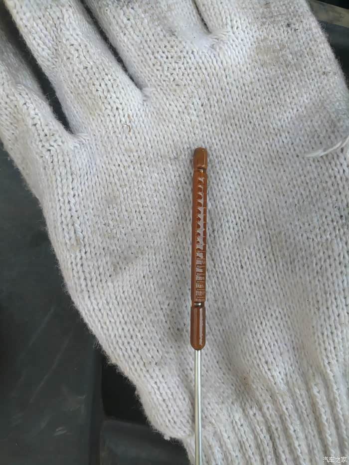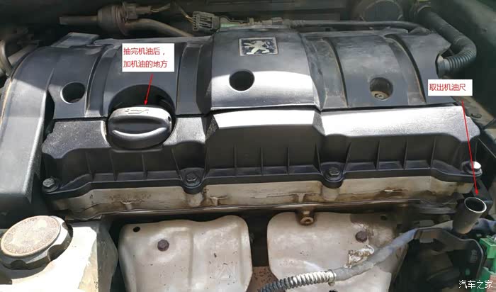 开始抽机油准备工作:从发动机右侧取出机油尺。注意,左边的加注机油的旋钮,抽机油前也要拧下,我这次没有拧开,所以3升机油抽了二十来分钟。