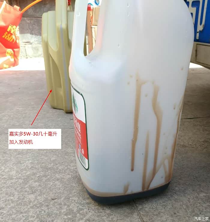 于是将从保养店里要来的别人保养后的嘉实多桶里剩下的几十毫升油倒回发动机,重新点火,给机油加温。