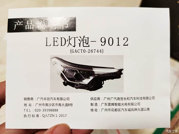 通过之前论坛里有分享购买过的车友分享的图片,利用图片在淘宝按图搜没有,然后直接搜他发的厂家,从厂家网站上看没有售卖渠道的链接。所以通过第三方平台找官方配件的便宜渠道是没有了,后来实在没办法买了一个跟这个官方配件差不多的比较相似的一个便宜灯泡200元一对,说是什么科锐灯珠,5000K色温,5000流明值,50W但实际效果换上后就呵呵了。切线没问题,因为原车自带透镜,但是亮度没比卤素好哪里去,特别是透镜聚光的部分非常的暗,还不如原车卤素。后来之前看有车友分享过他买的其他配件广汽的官方配件要比一汽的便宜很多,结果无意间发现了一个广汽丰田的官方配件,也就是CHR和18款雷凌用的9012型号的LED灯泡,价格稍微贵点498元一对,双十二471元一对下单了,数值上2000流明,5700K色温,24W,看参数一般,不太高。不过实际效果可比那个杂牌子的强太多了。所以原厂推荐的配件还是不错的。不过在这里还是麻烦各位不要要灯泡链接,不然我就成推销的了,还得挨一些论坛里的车友或者潜伏的赚钱商家骂,所以还是请各位自行搜索查找吧!