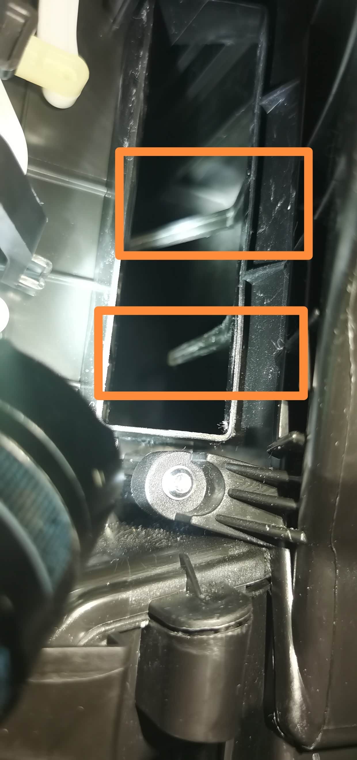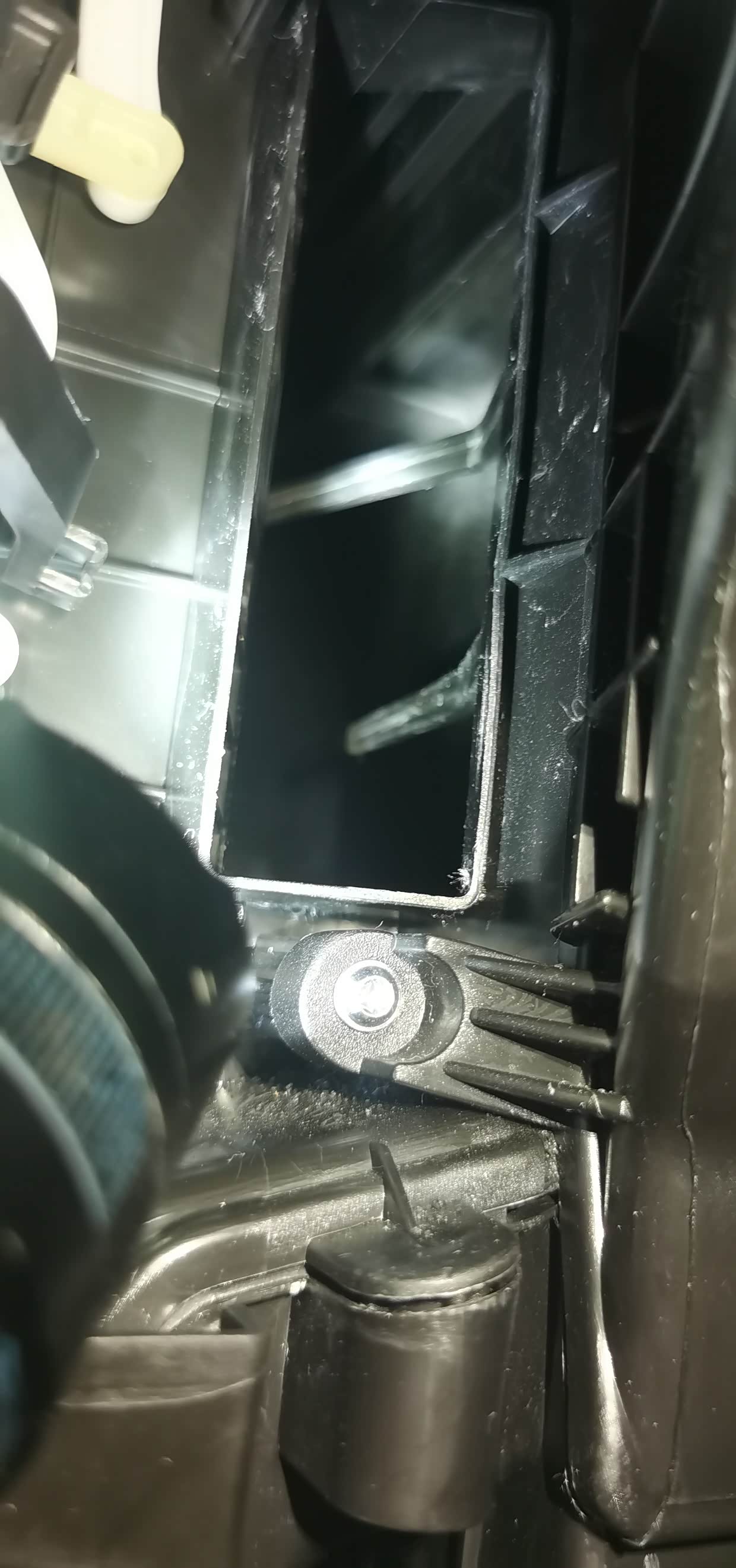 这二根塑料就是固定空调滤芯的。我的解决办法就是直接掰掉,扔掉了。10多分钟搞定.而且法系车的设计确实反人类。安装滤芯的空间太小了。空调滤芯只能捏瘪在往里面装。