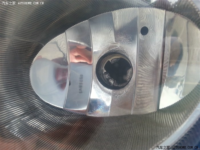 白天在路上试了下,结果就出现问题了,雾灯开了之后用了可能有十分钟,发现雾灯罩很热,手都不能碰,估计温度至少有80多度,当然外面的气温也有30多度。想着雾灯在前面,开的时候有风吹,应该不会出现什么意外,于是继续用,一个晚上过去了,直到第二天才发现问题了,雾灯由于功率太大,发热量高,导致我的反光碗出现小范围的熔化,看样子真的像SSSS店里人说的,存在安全隐患。