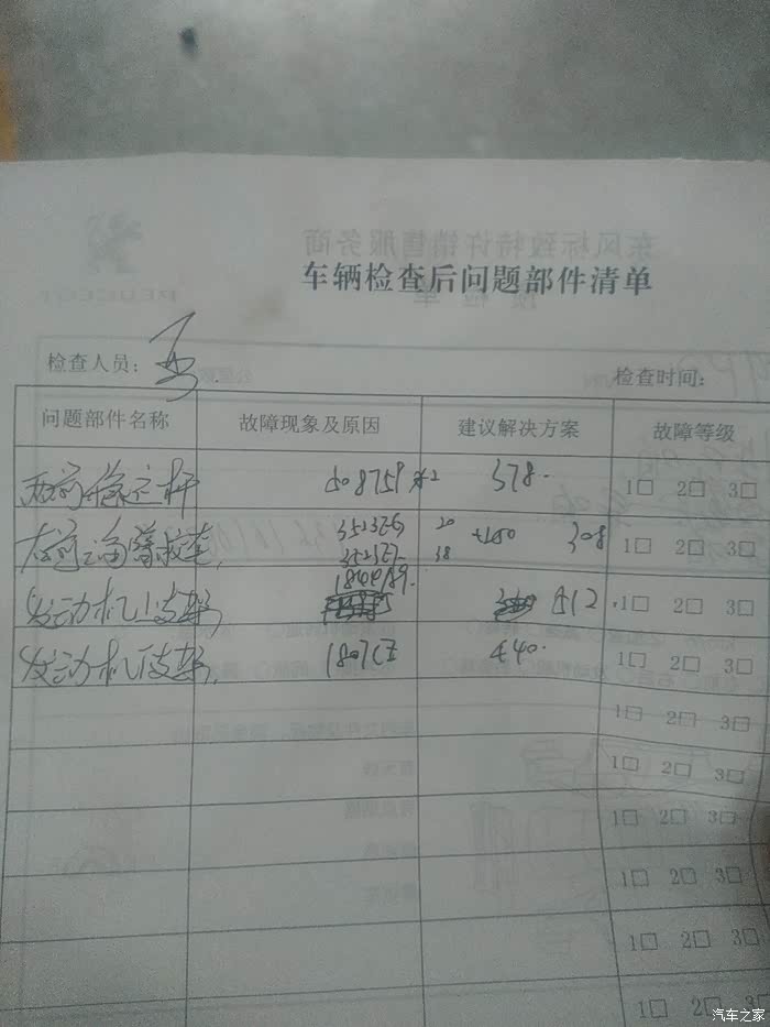 装好后试了下,大异响没了,但小异响还是有,听声音好像是前面发出来的,有检查了一下,说好多东西都老化了,要更换,更换了才没声音,不知道真的假的。更换的零件和价格如图,总共一千六百多