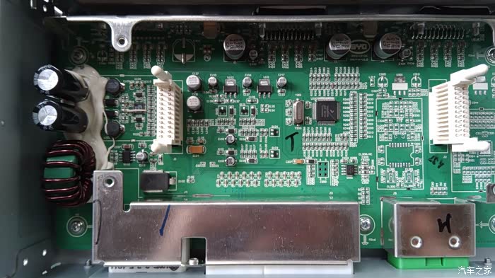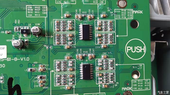 最上面就是两片功放芯片了(TDF8546J,AB类功放,45W,4通道,两片共8个通道,可接8只喇叭),板上还有几个空位,不知道是干啥嘀。