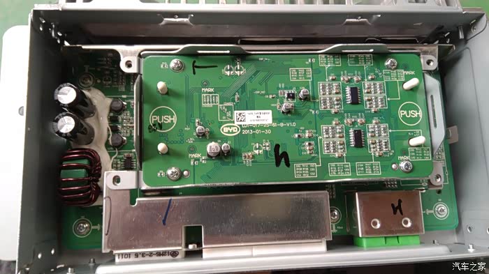 电源线,这个比普通车机用料多,无非就是常电,ACC等,看得出这个车机耗电不低,多根电源线并联输入,8通道的40W,共计320W,峰值约27A电流,AB类效率30%左右。散热也是问题。