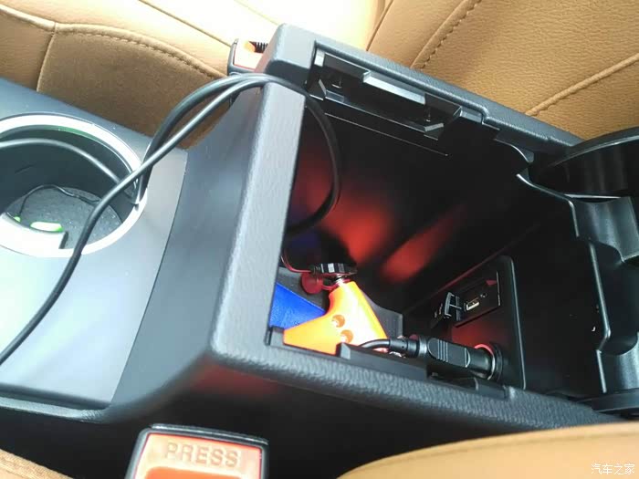 因为线材不够长,只能这样插在扶手箱里。为什么要插扶手箱而不插点烟器,最后我再来说明。