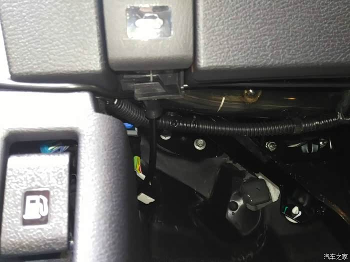 油箱盖开关这里拐个弯,穿过里面这条塑料管上面,然后沿着发动机舱开关这个下沿一直走到另一侧。