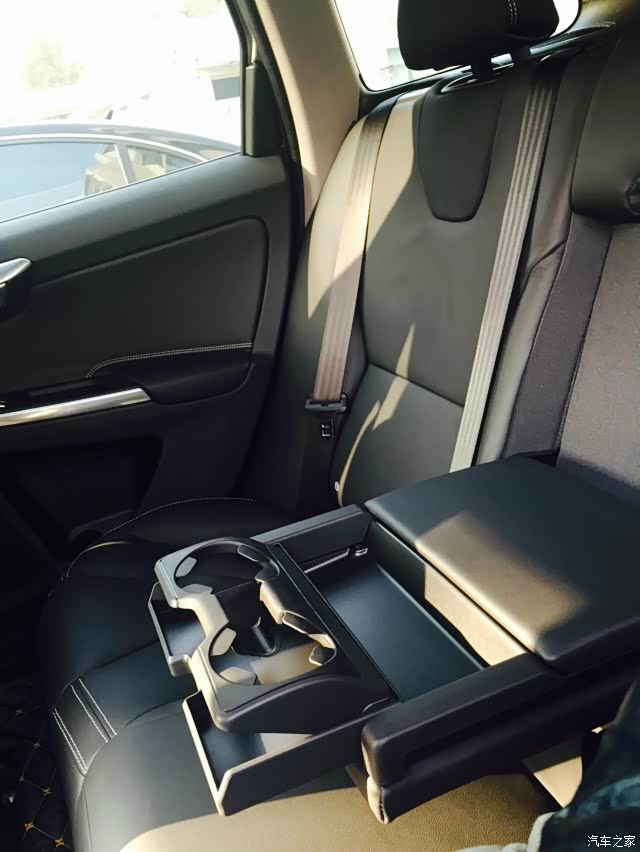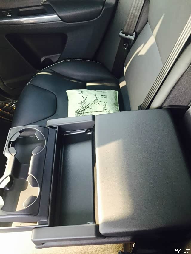 后排中间座椅放下可以当扶手和杯架,长途旅行可以给吃货们放吃的。很不错