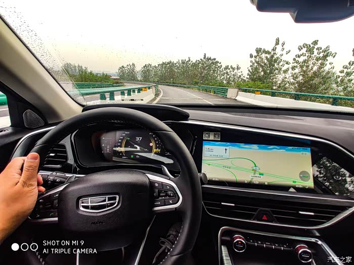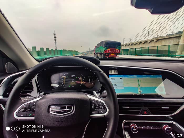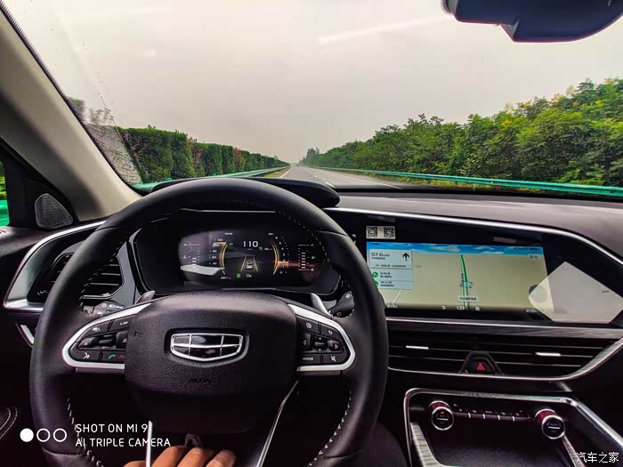 这个时候我还没有使用自适应巡航,可以看到星越的仪表盘可以把导航的路线显示在上面,这样有些朋友不喜欢导航的声音,就可以关闭声音,看仪表盘的路线指示就行了,这里还要说一下,星越的中控屏幕真的不错,显示效果非常好,没有反光看不清的情况,有些车子因为用的显示屏幕品质太差,有点角度就看不清了。。