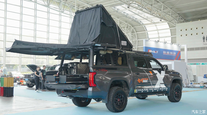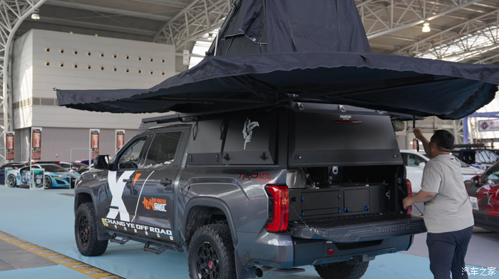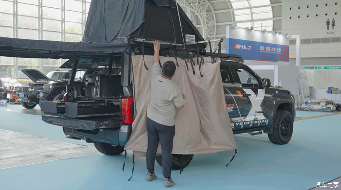 首先是一个标配全铝的箱体,防水还防灰,在里面永远没看不到灰迹,密封性做得特别好,然后还有掀盖式的车顶帐篷、270度的帐篷、还有户外洗澡淋浴设施。对了,还有露营需要的厨具和储物柜,这些都必须得有,在户外来个BBQ或者烧菜都是可以的。