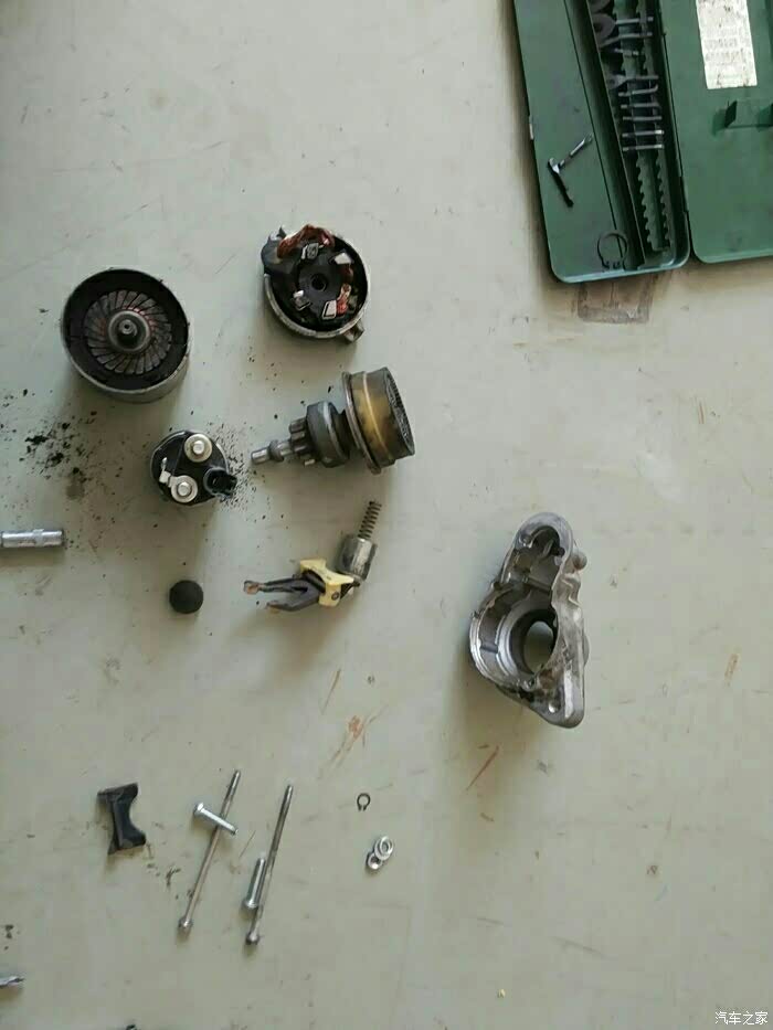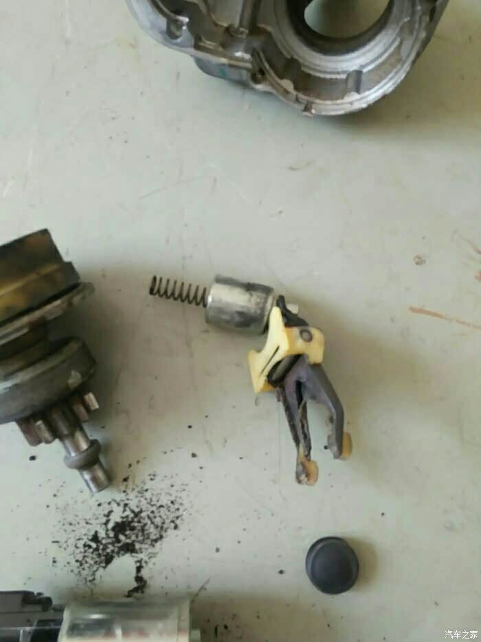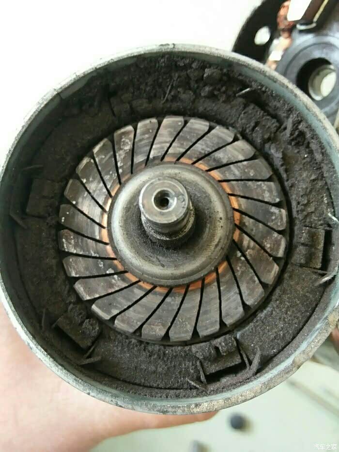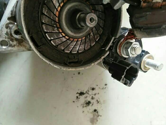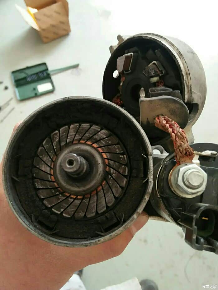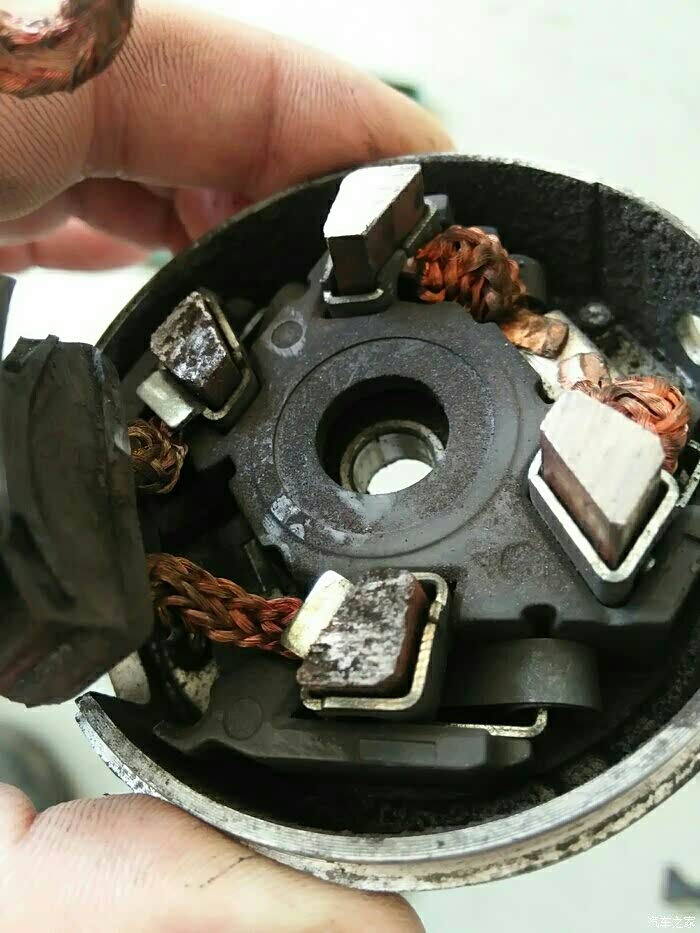 碳刷:将外部电流施加到转子的中间物质。碳刷使用石墨加铜粉制成,这辆车主要原因就是起动机内的碳刷磨损严重造成碳刷无法接触到转子无法将电流施加到转子上无法使起动机运转,造成车辆无法启动,这个碳刷可以单独更换,这车的碳刷已经挨不住转子了,所以启动不着车。