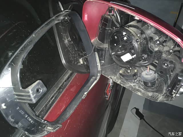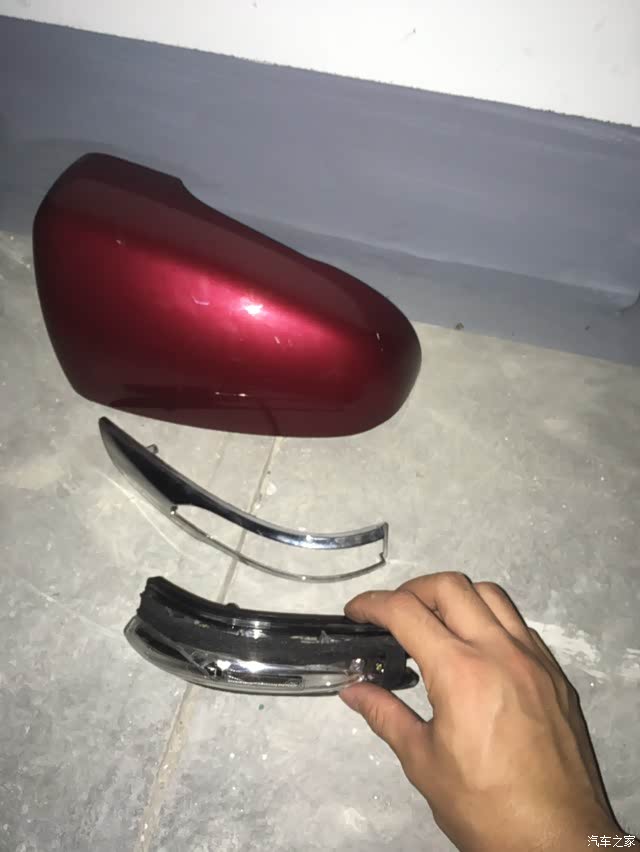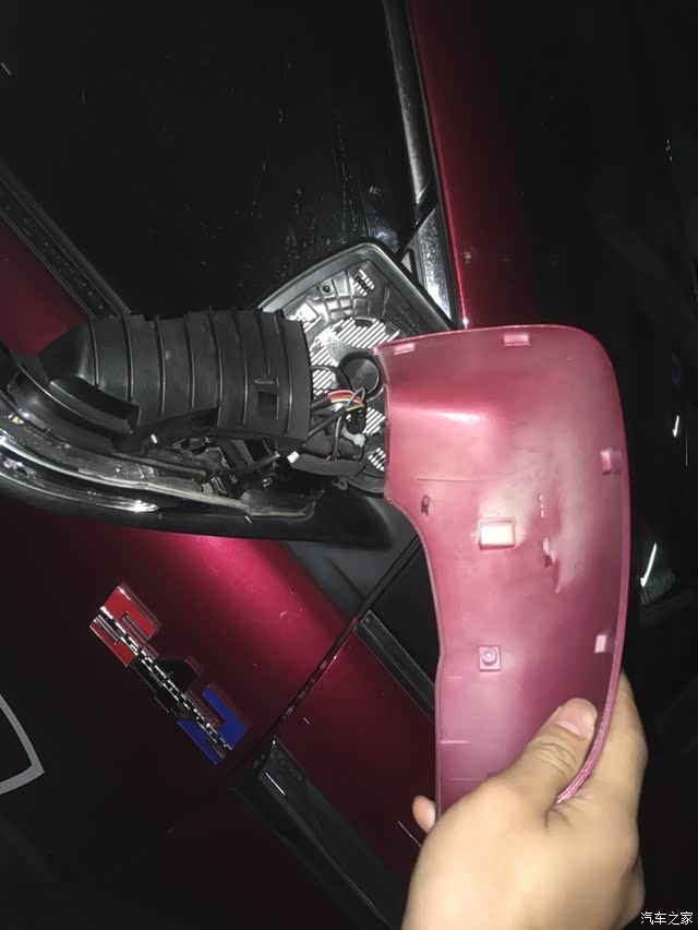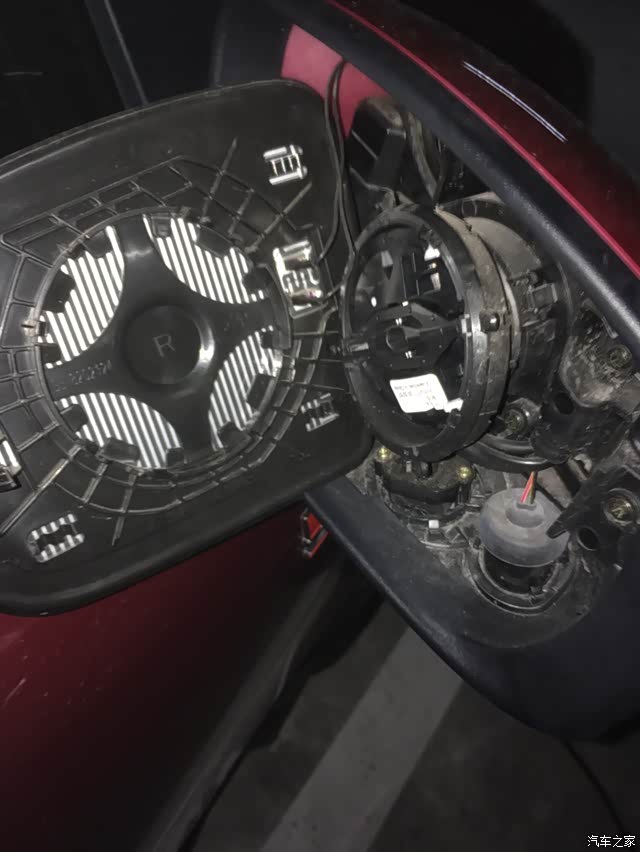 三 周围有红色卡扣把后视镜壳子固定在总成上 有两个是在内部看不到的位置 只要扣掉左右两个 然后胆大心细向后掰就下来了 还好没有破坏外壳