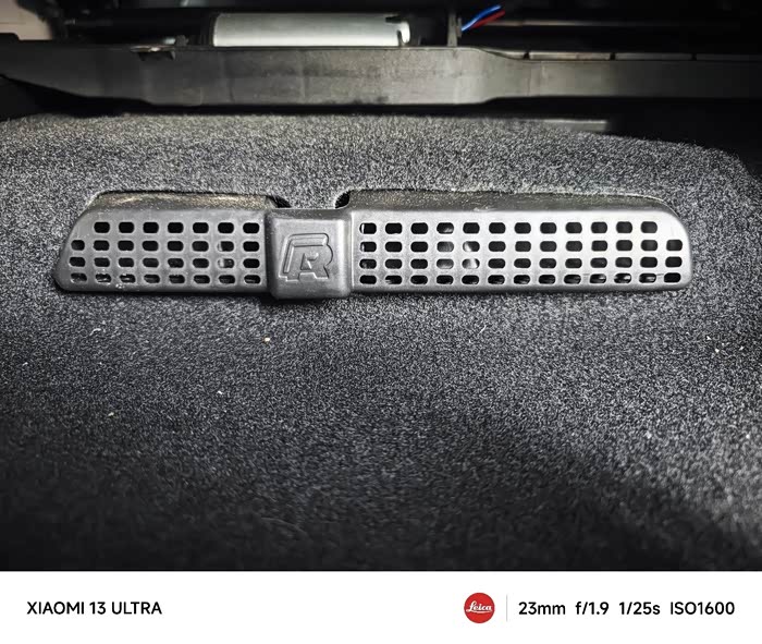 这是前排座椅下的空调出风口,原厂是裸露的,装上这个罩子既美观又能起到阻物的作用,当然R标还是不能缺席的😂