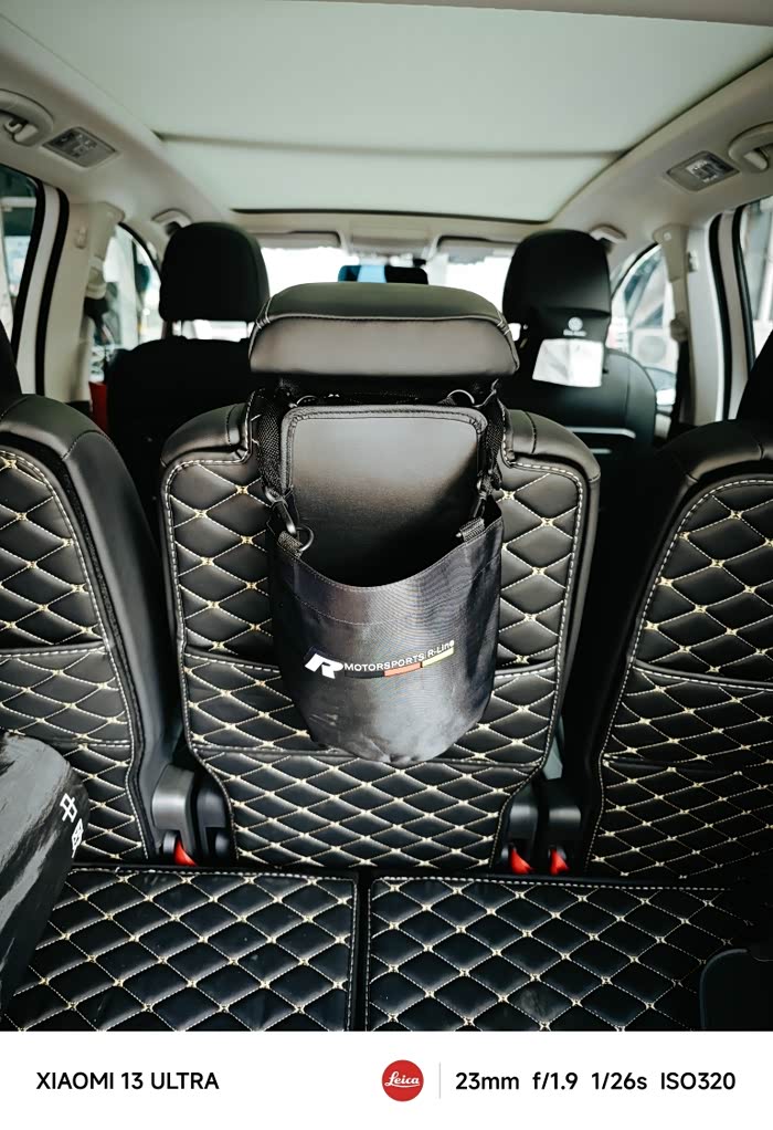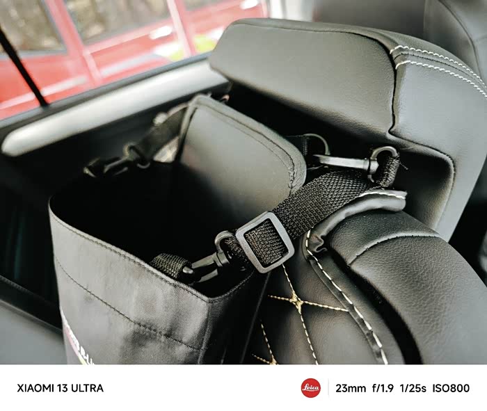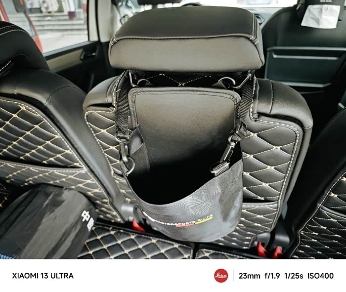 袋子容量很大,可以装下2升水的暖瓶,上面用绑带绑在头枕杆儿上,中间用魔术贴贴在椅背上,下面正好插在垫子的口袋里,整体效果非常完美👌🏻