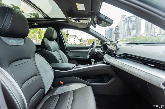 相对于个性化的外观,我这车的内饰就显得比较中规中矩了,内饰配色是黑色和灰色的组合,对于我这种比较懒的人来说比较耐脏,不需要经常打理。12.3英寸的全液晶仪表盘和悬浮式的中控屏是标配。座椅是皮制和Alcantara的混搭材质,质感很不错,尤其是上面蓝色的缝线设计给人感觉做工很精细,细节做得很到位。