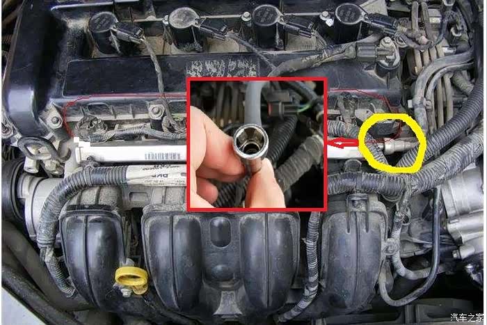 找到供油管,连接喷油嘴共轨的地方有个接头,往里按能动,拔就拔不出来,原来里面有4个弹片卡住,需要用专用工具或螺丝刀顶住才能拆下来;而我没有专用工具,担心拆坏漏油,就没有从这里下手。