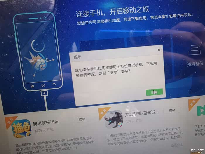 提示车机下载应用宝。点击继续同意。