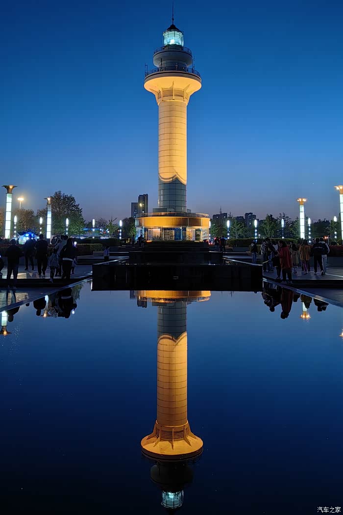 在门口远远的就可以看到已经打上灯光的灯塔 , 灯塔的前面有一个水池,倒影映在水中,应该比白天还更增加了一些韵味