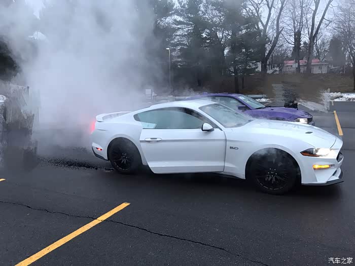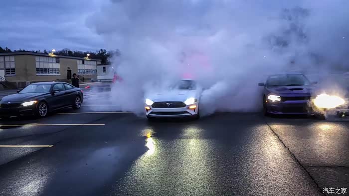 Mustang的linelock功能 就是烧胎 烧完就跑 后面的清洁工大叔可能以为我们车坏了 还想报警哈哈哈