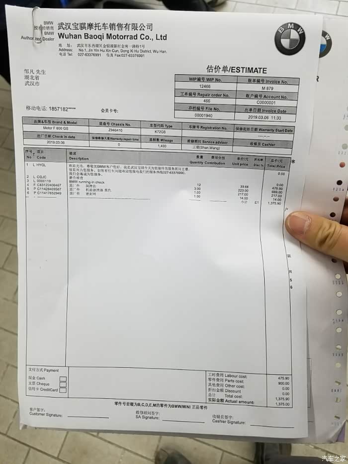 换了3瓶原厂机油,1个机滤1375,价格真的不便宜