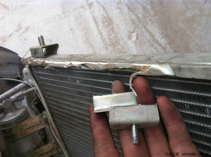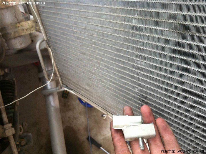现将空调冷凝器安装风扇的螺柱切掉,不然会和大水箱干涉。