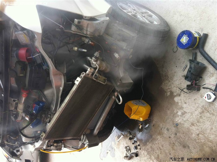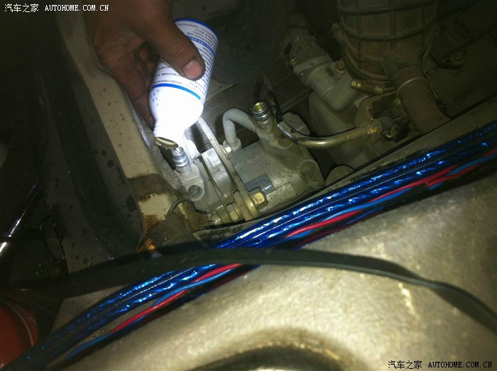 下一步将发动机缸体内的旧防冻液用压缩气顶出来,将起源接在水箱的上部连接水管打气就可以,千万要尽可能的排干净,不然又混加了。