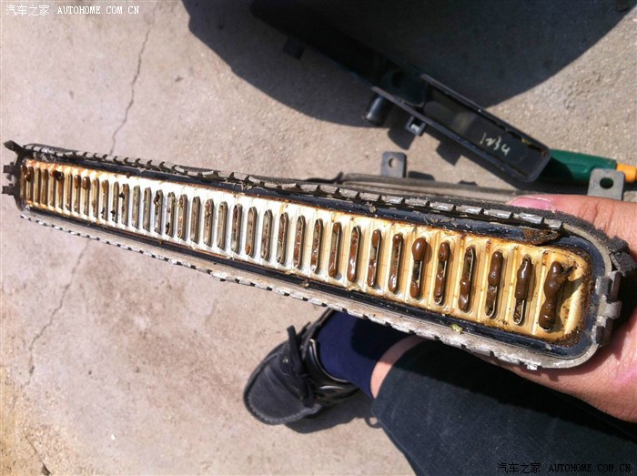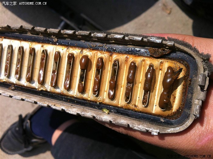 插播一下:看一下原车水箱被劣质防冻液侵害的情况。再次提醒各位更换防冻液要换正规的品牌,缸体内部的防冻液要尽量放出,不同型号及品牌的防冻液千万不要混加,觉得没事的请再看看上面的两张图片。