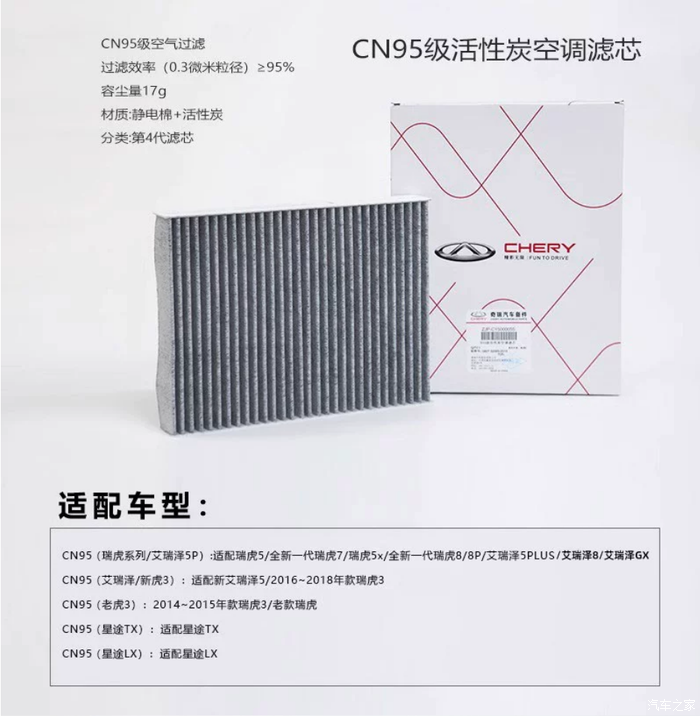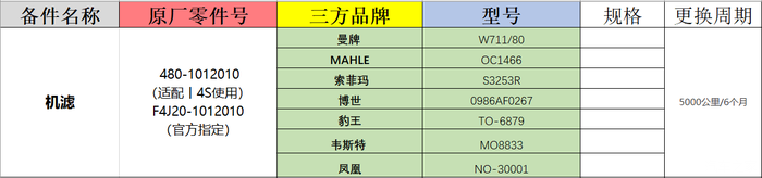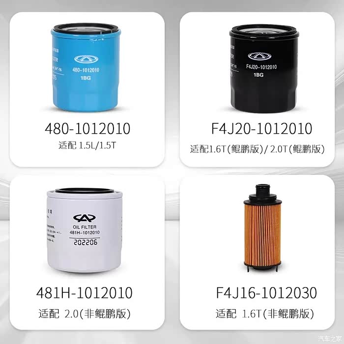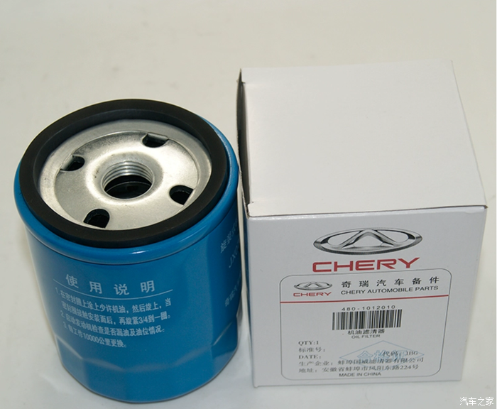 出厂及奇瑞天猫旗舰店适配的型号是F4J20-1012010(黑色),但有的4S店不知是出于成本考虑还是其他原因保养时给用装480-1012010蓝色铁机滤,这两个接口尺寸是一样的,装车后使用感受也没有明显区别,具体原因不清楚。