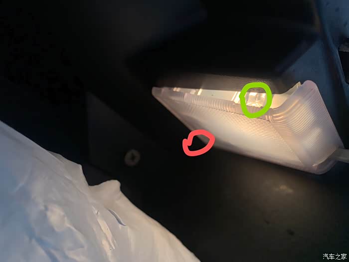 手套箱的灯罩,先撬绿圈位置,等灯罩退出一部分再向下向后用力撬红圈处。