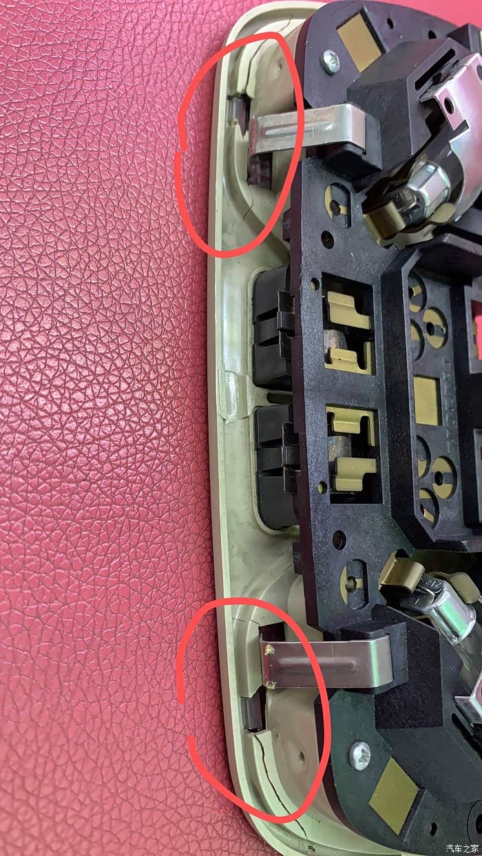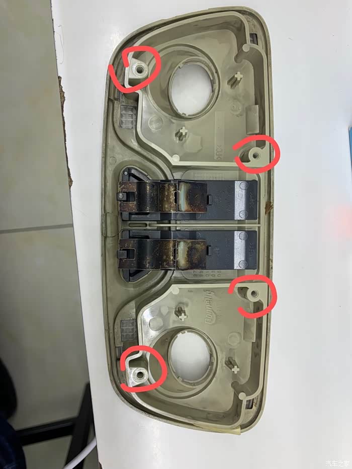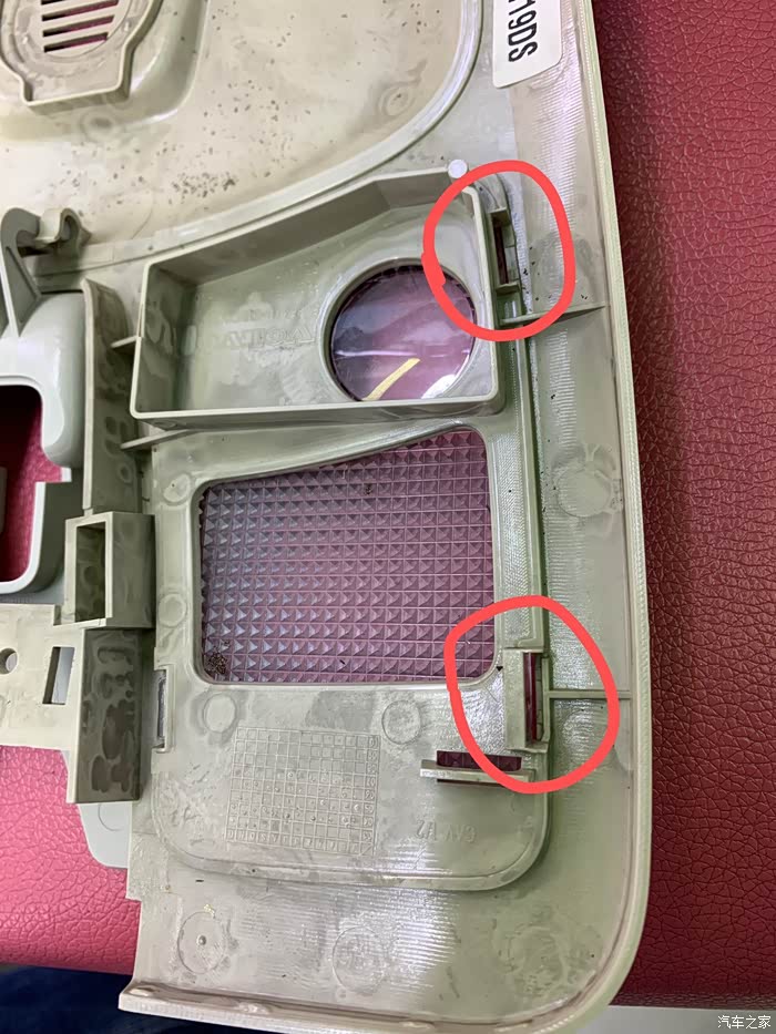 这是驾驶位头上方的照明灯,从红圈处着手把天窗开关旁边的“ V”型塑料面板取下。下图是照明灯整个面板拆开后的样子,请各位车友仔细看看,以免在拆的时候拆断塑料卡扣。