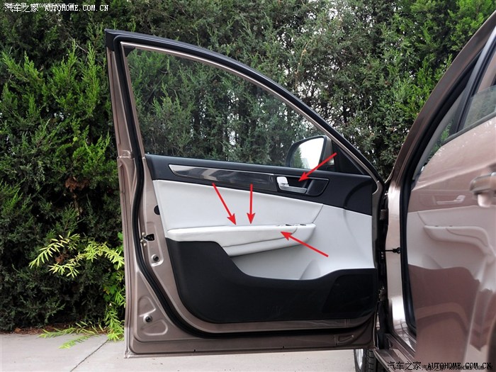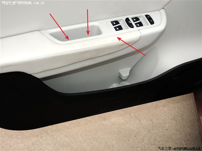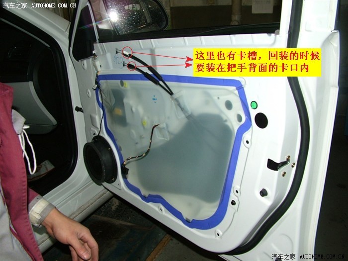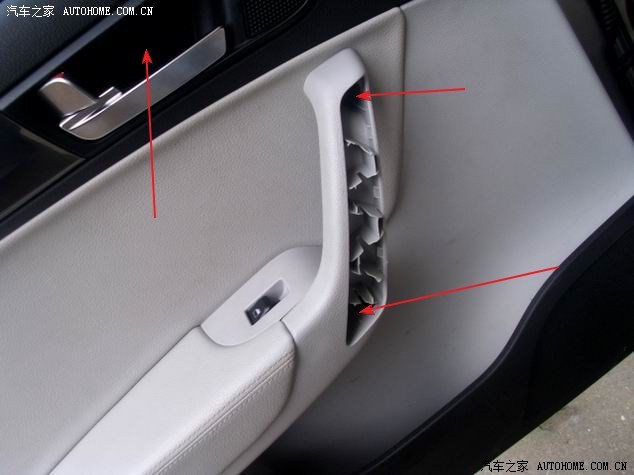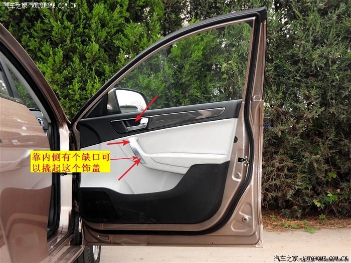 左前门螺丝位置(下图)(部分图是借的,说明是我添加的)。车门拉手内有一个盖板,撬开后里面有一颗螺丝。