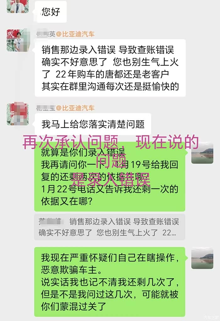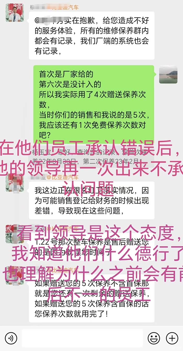 1月19日微信客服确认剩余2次保养(截图存证),3天后到店却被告知仅剩1次(有电话录音)!1月22日的保养因未我是一早到店直到下午六点车再回来,保养超时加之只保养了纯电系统,所以告知我本次保养为免费赠送,不计入赠送保养次数,所以我当时没有太细的额外追究,心理默默接受了还剩一次的情况,但是无德4S店进一步刷新我的认知