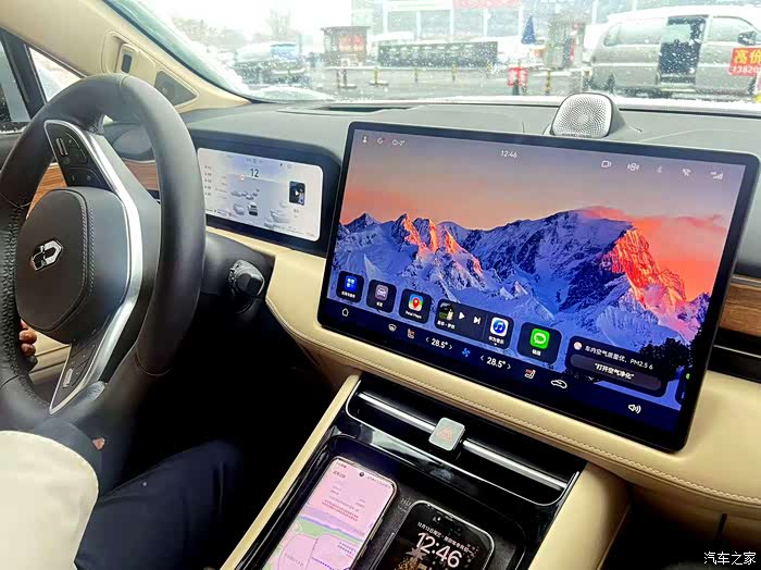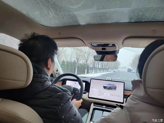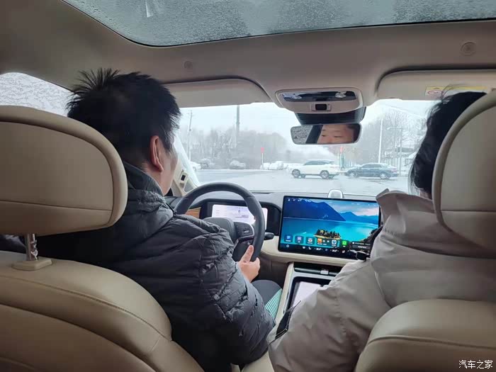 这次试驾是后驱智驾版本,尤其是下雪天气,后驱版本,在牵引力控制下,车辆并没有出现打滑失控的现象,整体操控非常舒服,标准模式下动力输出衔接顺畅,尤其是全铝合金的底盘,对于车辆的虑震和转弯时的支持都是非常到位的,整体感觉韧性非常好。因为雪天路滑,也不敢暴力驾驶,但是着北方的大雪天有个座椅加热是非常舒适的,尤其是对女性驾驶员来说,简直就是非常的贴心的配置了。而且车辆配备了激光雷达和毫米波雷达,使得路面上行驶的车辆都可以映射到液晶仪表盘,而且在慢速转弯时车机自动开启360环影,可以很好的监控到盲区视野。在打转向灯准备转弯时,会把转向一侧的车后方的路面情况投视在车机的中控大屏上,非常清晰反应也很灵敏。