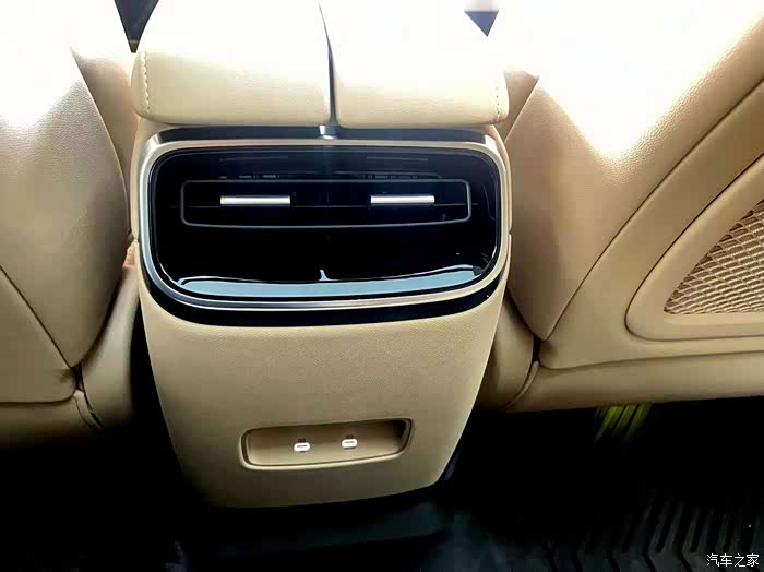 后排配备了独立出风口,只不过配有钢琴漆面板,很容易留下指纹。底部还有两个扩展充电口。