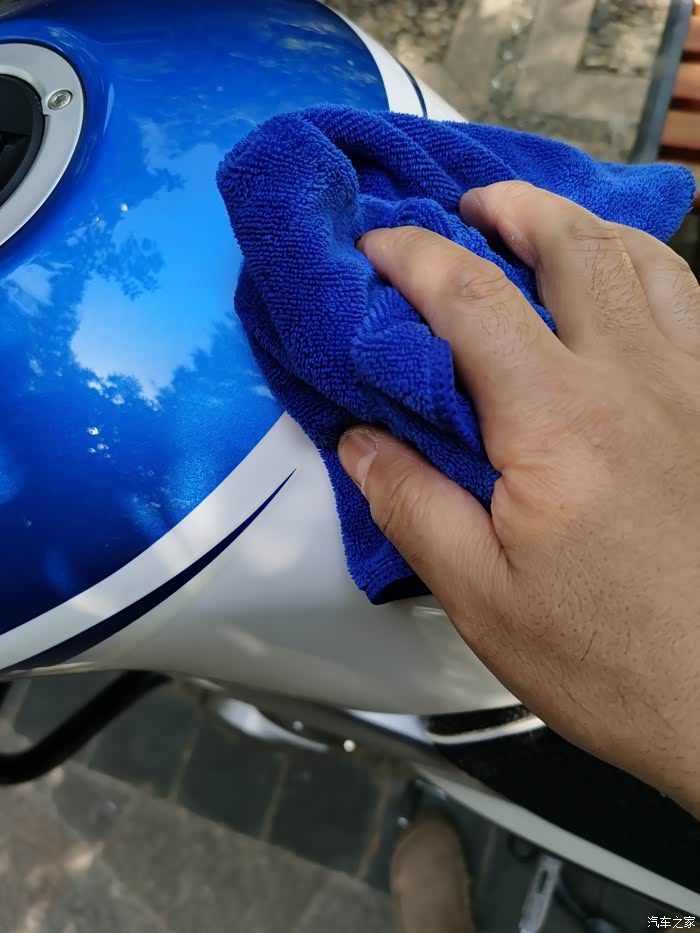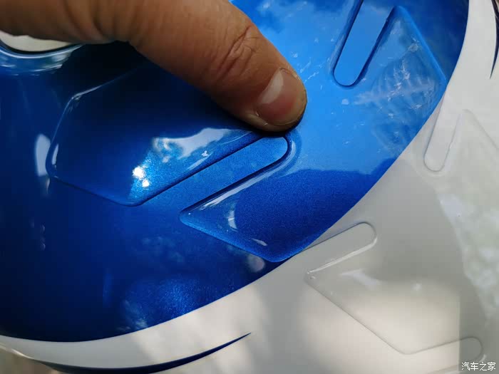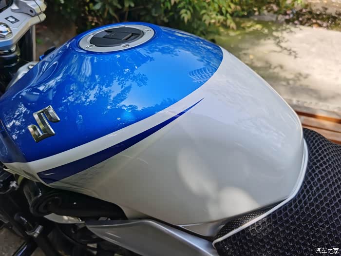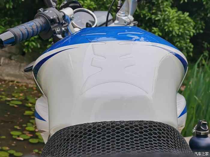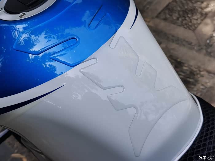 这款机车采用蓝色和白色相拼涂装,蓝色为金属漆,大品牌厂家工艺上乘,涂装均匀,色彩靓丽。开了七年一直没给油箱贴膜,长期骑行,衣物与油箱摩擦虽然没有给漆面造成磨损,时间久了还是准备粘贴鱼骨贴来保护漆面。