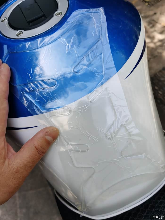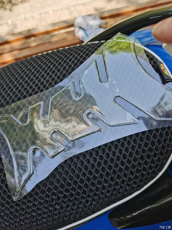 找了个晴朗的天气,停好车子准备透明,现将鱼骨贴在油箱上找好粘贴位置。