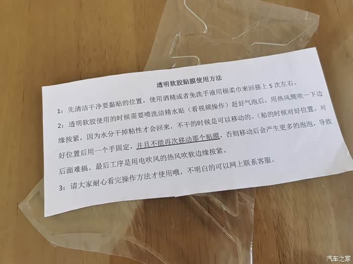 随产品一起寄来的软胶贴膜使用方法,以前给老途观贴过拉手贴过透明膜,方法基本是一样的。