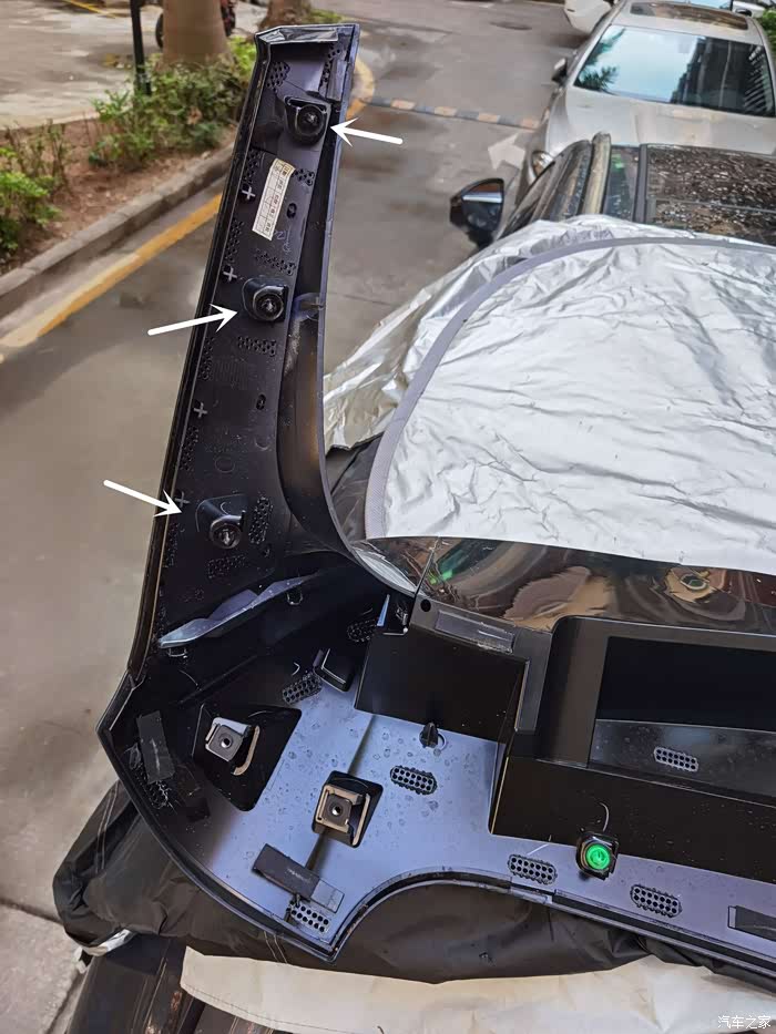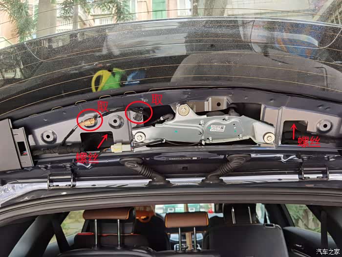 取出护罩,接着是取下后视镜的接线头,接线头藏在顶蓬鼓包里,拉出后断开连接。然后再卸下后视镜,按照车友的做法“抓住后视镜左摇右摇就下来了”,结果搞爆了玻璃。