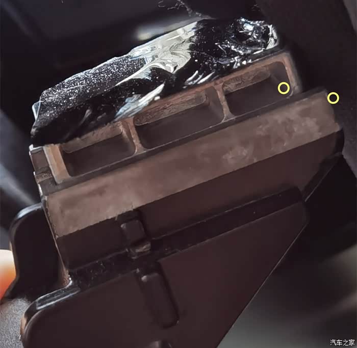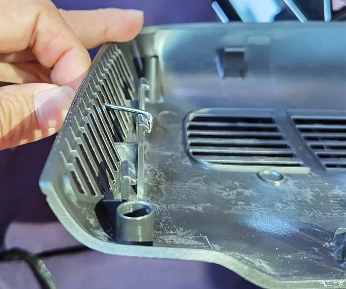 看上面,破的玻璃还粘在上面。经检查,支架与顶部的安装块咬合非常紧密,从外看就像是一个整体,可以用尖嘴钳夹图上两个点取下。