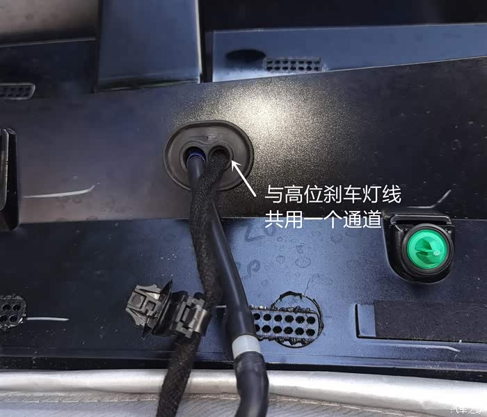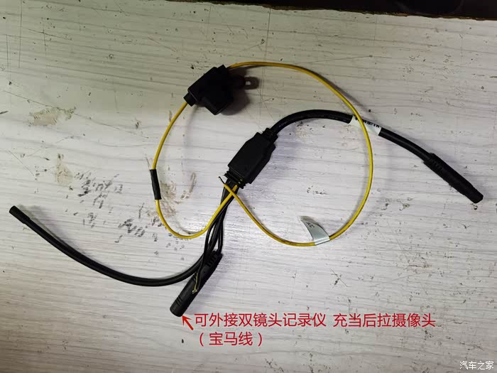 剪短主机电源线,我特地查过这个接记录仪的功能。可以接在双摄像头记录仪上(这个线头我剪开了,里面只有两根线,经测试无信号输出,我打电话到厂家售后咨询过,确定这条线没有作用,接不了记录仪)。